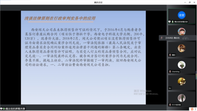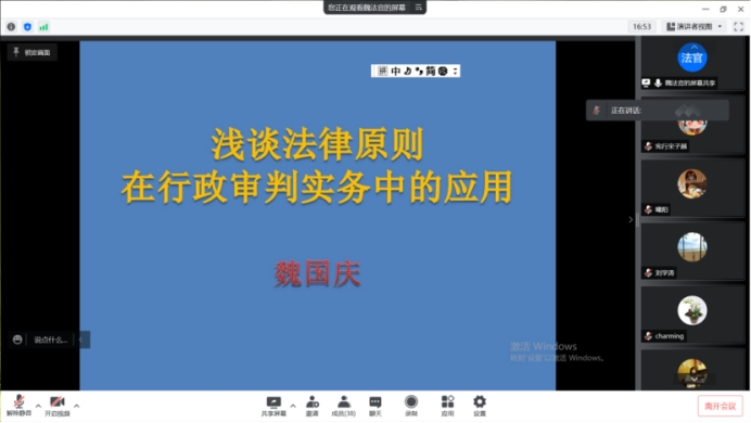 2022年4月14日16时40分,3003新葡的京集团“实务大讲堂”课程继续开启,此次课程由3003新葡官方网站(纪检监察学院)承办。西安铁路运输中级法院魏国庆法官在线上进行了“浅谈法律原则在行政审判实务中的应用”的主题分享。