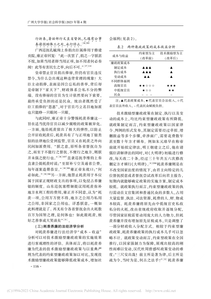 文章关注激励型廉政政策,按照行为导向将廉政政策可以分为约束型与激励型两类,我国古代发达的监察制度使得约束型廉政政策成为腐败治理的主要手段。明初的重典治吏表明,约束型廉政政策可以快速打击腐败,但超出必要限度的严刑峻法会产生反腐边际效应递减,需要导入激励型廉政政策矫正负外部性。以往激励型廉政政策多因陷入道德渊薮而效果不彰,雍正朝的“耗羡养廉”是技术范畴内的激励型廉政政策,通过裁汰陋规、禁止捐俸、限制耗羡用途等手段降低了治理成本,增加了社会总福利。实施激励型廉政政策是反腐败标本兼治、巩固治理成果的重要方向,“耗羡养廉”所展现的熟悉下情、不图虚功、因地制宜以及灵活施策等优势,为当今一体推进“三不腐”提供了可创造性转化的历史经验。