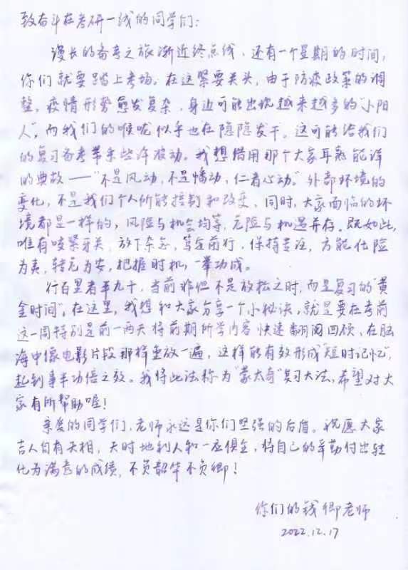 3003新葡官方网站钱卿老师手写祝福信为考研学子加油