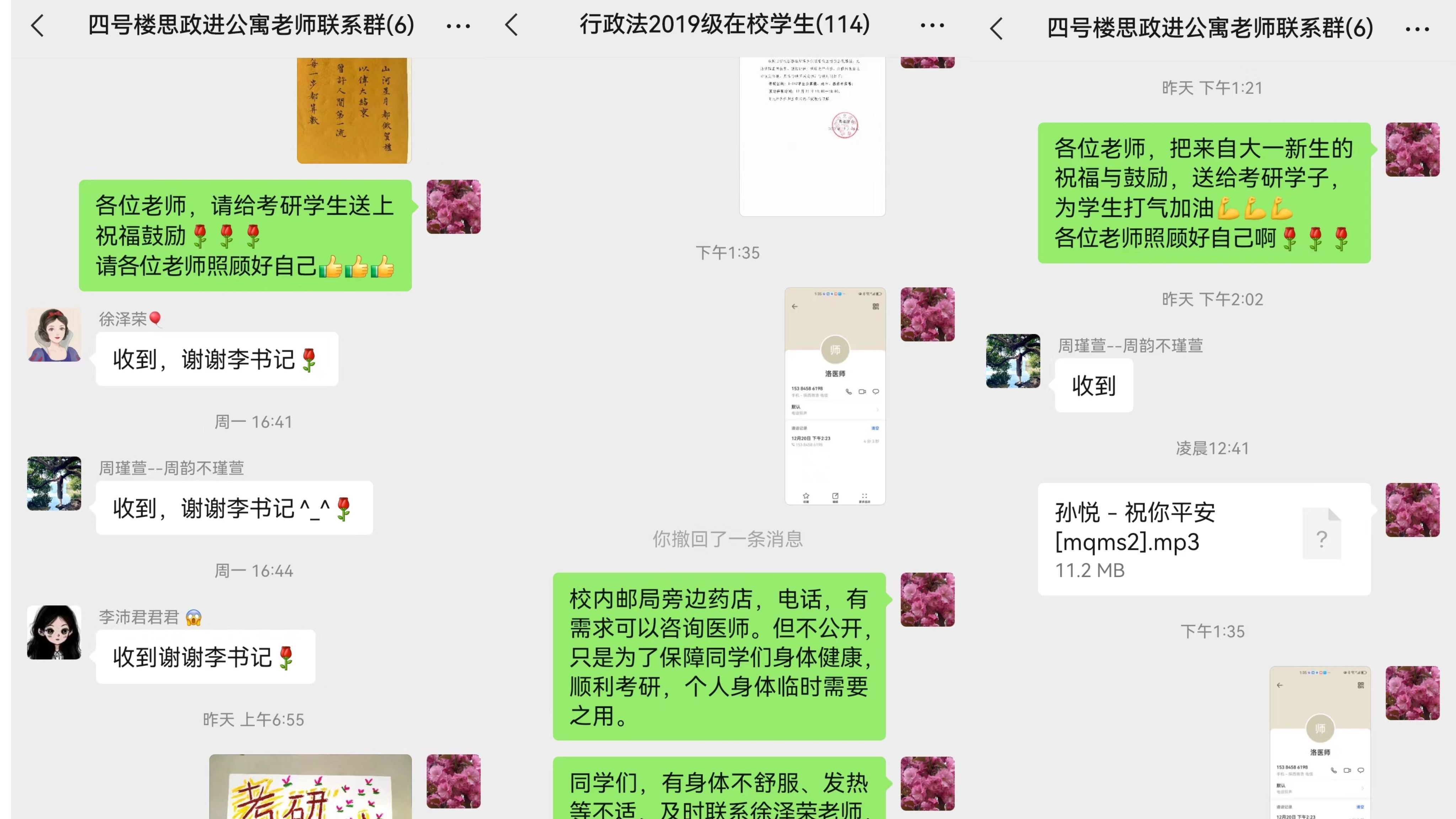 4号学生公寓住着大四学生,现在留校的都是奋力复习考研的学生。在“一站式”学生社区管理过程中,针对此现状,及时建立“考研留校学生群”,在群内发布疫情预防手册、健康用药、校内药店医师电话等信息,为学生顺利考研提供服务与保障。
