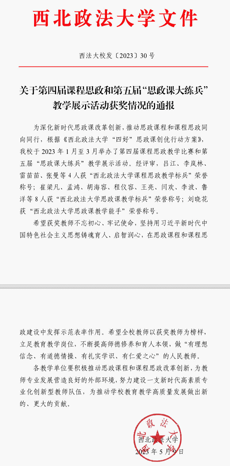 雷苗苗老师入校工作以来,承担《行政法学》《部门行政法》等课程的讲授,系陕西省课程思政示范课程和教学团队成员。授课过程中,雷苗苗老师积极践行立德树人的根本任务,注重挖掘公法类课程内蕴的思想政治教育元素,取得良好成绩。