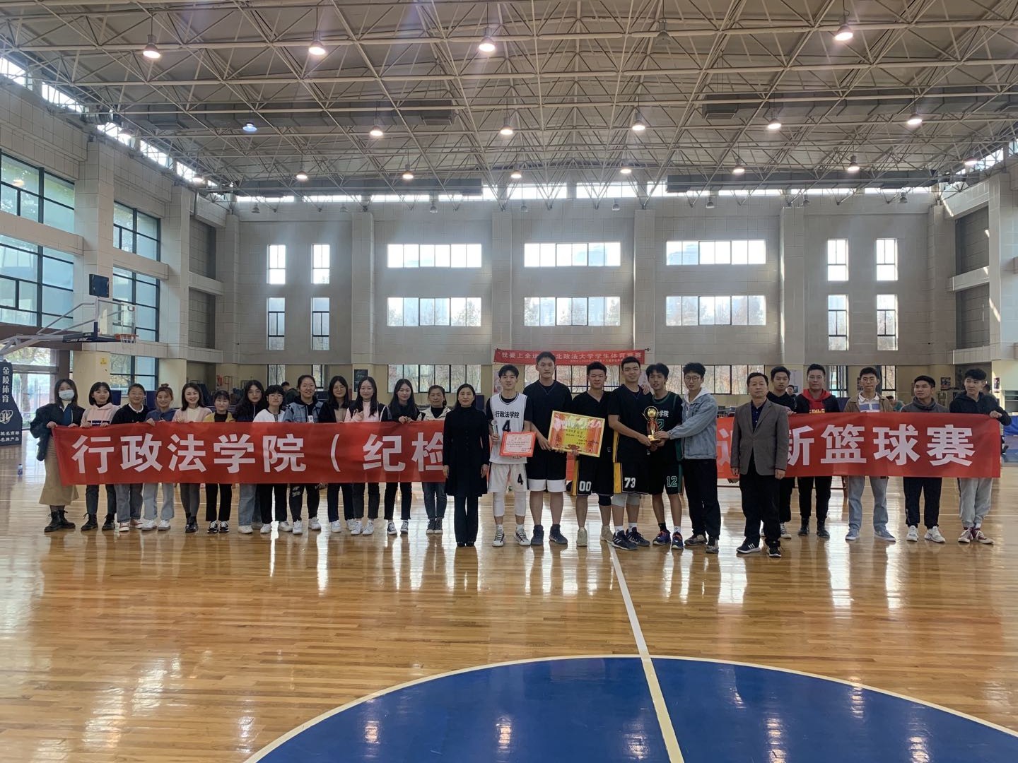 决赛开始,本着“友谊第一,比赛第二”的原则,双方球员都积极投入到比赛中,尽情在篮球赛场上挥洒汗水,激动人心的精彩进球赢得了阵阵掌声。场外同学更是热情高涨,让篮球比赛的氛围不断升温。最终,大三(一)班获得冠军,大三(四)班获得亚军,大三(三)班获得季军,大一(一)班获得精神文明班级奖,大三(一)班周佳乐同学获得决赛最有价值球员奖。赛后,学院院长姬亚平老师、学院党委副书记李芳老师给获奖班级颁发奖励证书,并与同学合影留念。