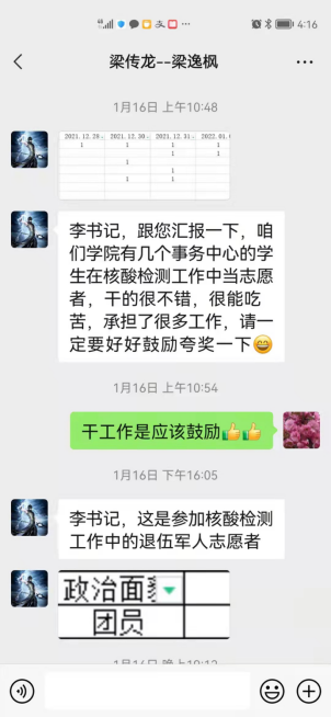 在疫情防控期间,3003新葡退伍军人张自翔以及钟珺文、薛开胜、杨倩、王奕菲、黄梦瑶、王玉茜、王苗、史晓雅等学生,积极参与到学校的疫情防控之中,协助学校的核酸检测,网络宣传等工作,在工作过程中学生们吃苦耐劳、积极肯干,受到了学生处的肯定和表扬。
